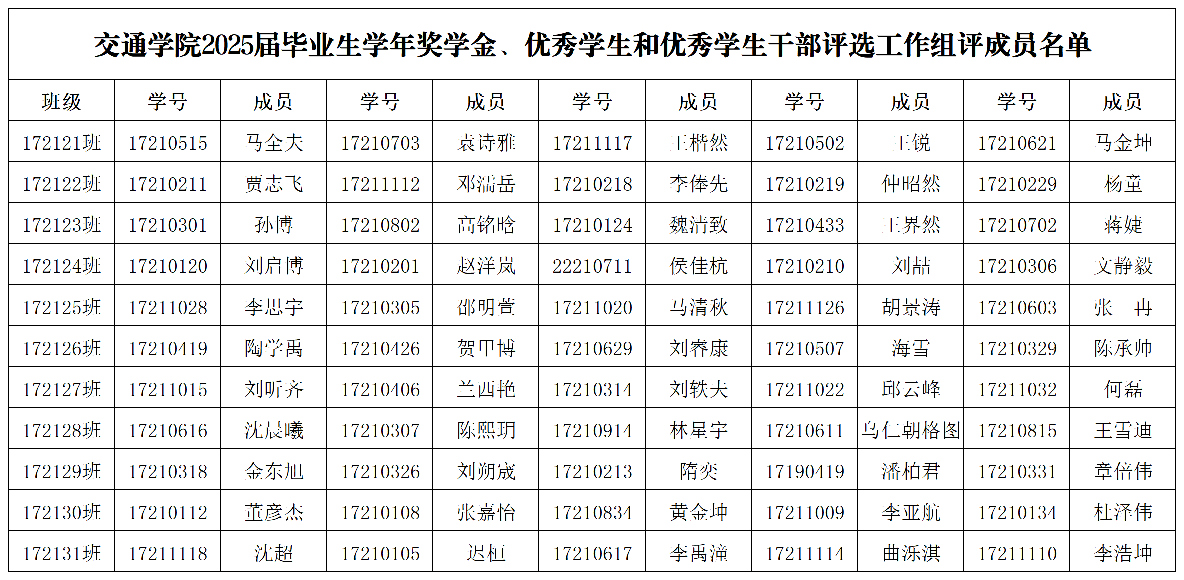 根据党委学生工作部《关于开展2025届毕业生学年奖学金、优秀学生和优秀学生干部评选工作的通知》相关要求,黑料正能量 按照班级为单位成立组评小组(小组成员一般由学生党员、学生干部、学生代表组成,总人数不少于5人,其中设组长1人)。现将2025届毕业生学年奖学金、优秀学生和优秀学生干部评选工作组评小组成员名单公布如下(各组评小组首位为组长)。