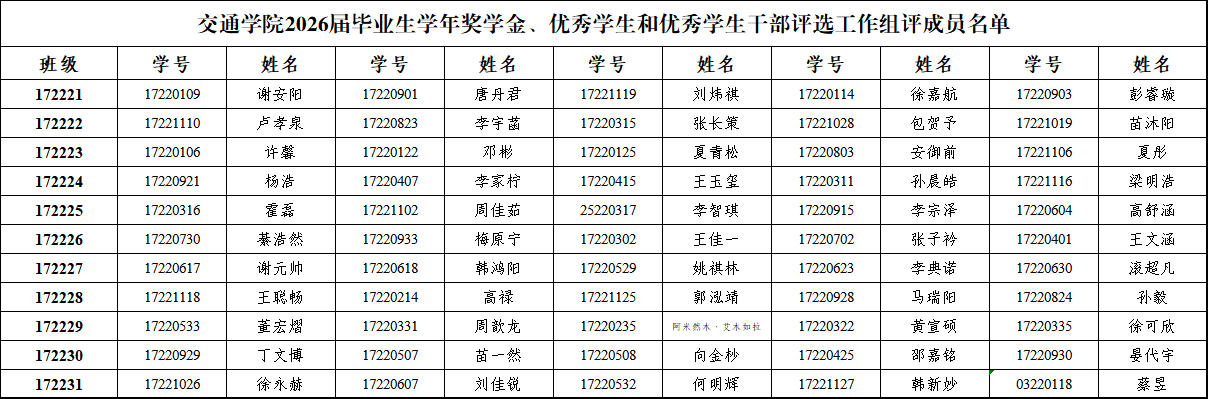 根据党委学生工作部《关于开展2026届毕业生学年奖学金、优秀学生和优秀学生干部评选工作的通知》相关要求,黑料正能量 按照班级为单位成立组评小组(小组成员一般由学生党员、学生干部、学生代表组成,总人数不少于5人,其中设组长1人)。现将2026届毕业生学年奖学金、优秀学生和优秀学生干部评选工作组评小组成员名单公布如下(各组评小组首位为组长)。